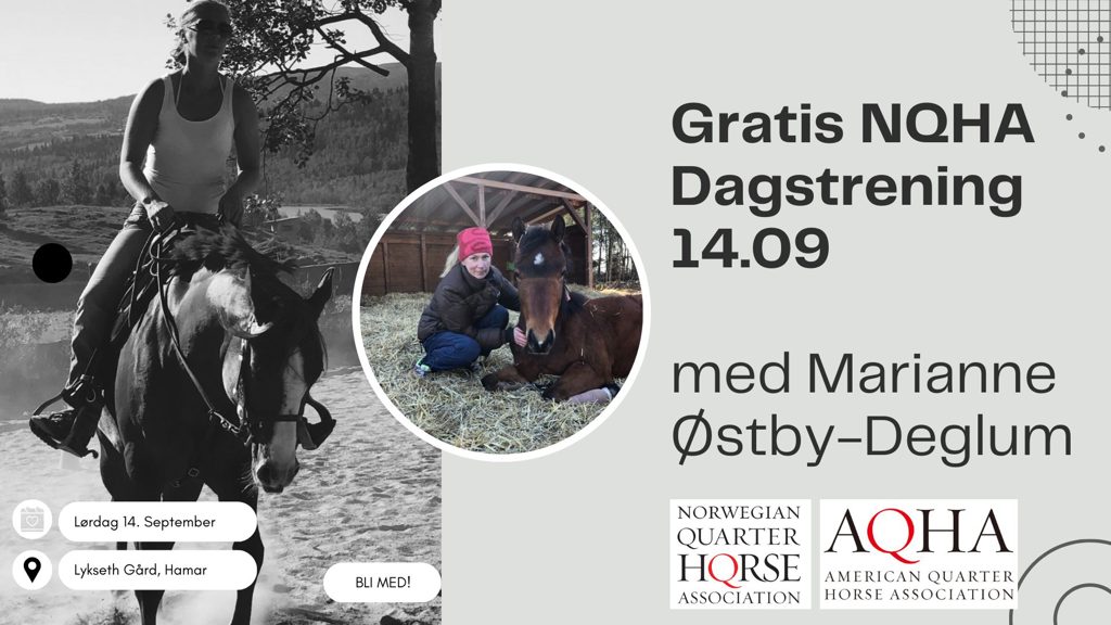 NQHA og AQHA inviterer til åpen trening for alle lørdag 14.09 på Lykseth gård med trener Marianne Østby-Deglum. Marianne er den første norske utnevnte til AQHA Professional Horseman, som også er utdannet hestefaglært, ridelærer trinn 1 fra Norsk Hestefagskole, pedagog og har diplom fra HEAL USA.